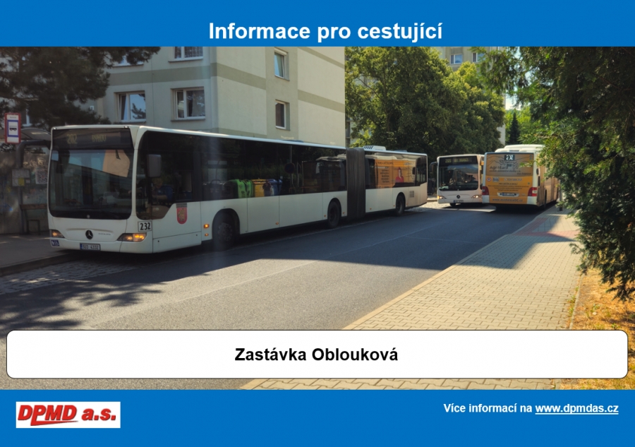 Linka č. 202 bude zastávku Oblouková obsluhovat od čtvrtka 21. 8. 2025, kdy spoje budou v zastávce ukončeny a začínat směr Bynov. Konečná zastávka Staré Město nebude dočasně obsluhována.